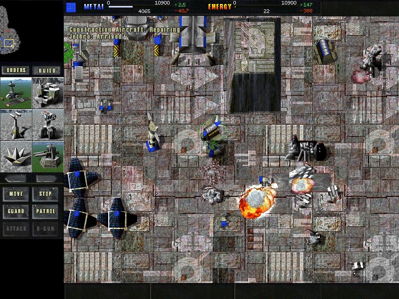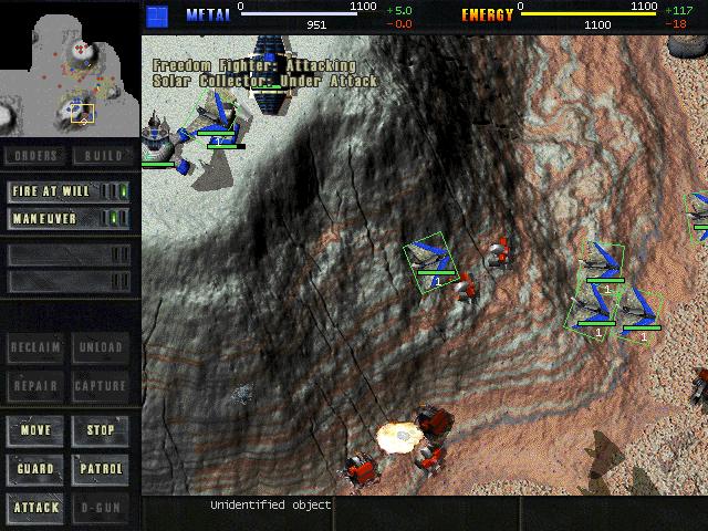 The game's interface is simplicity itself. I had balked at Dark Reign's options initially; I was happy to see them, but sometimes they were a bit too much to handle. I will say that I missed them once I moved to TA, but not for long. Each unit's behaviors can be tailored to a certain extent; one button switches the unit from 'Hold Fire,' to 'Return Fire,' to 'Fire At Will'. The next button determines how much maneuvering a unit will do: 'Hold Position,' 'Maneuver,' and 'Roam'. Not quite as much flexibility as DR, but you won't miss it. Another impressive feature is the ability to queue any number and any combination of orders on a unit. For example, click a construction vehicle, and tell it to move here, gather this tree, gather this wreckage, repair this factory, build a turret here and here, then move here and patrol this area. This takes a lot of pressure off of the player and allows you to coordinate several operations at a time without botching any of them. Combine this option with hotkey controls for any order in the game, and you've got a quick and easy two-finger interface. One armed persons should stick to Command & Conquer.